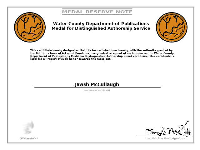 It's time now, finally, to present such an award to recepient of which has been decided by this publication. With careful consideration of the aformentioned examples above, we've looked deep into their spirit and do believe that we do so in similar regard. As there is no one else available to perform the ceremonies, I, the author of this article, on behalf of my self, do hereby present the Water County Department of Publications Medal for Distinguished Authorship Service to the man who has contributed the greatest volume of articles to FrillerWorks, my fellow self: Jawsh McCullaugh. He has clearly deserved such meaningful recognition, and is the perfect man for such distinguishment. Oh yes, just like the real thing, this also is totally not a joke and completely meaningful.